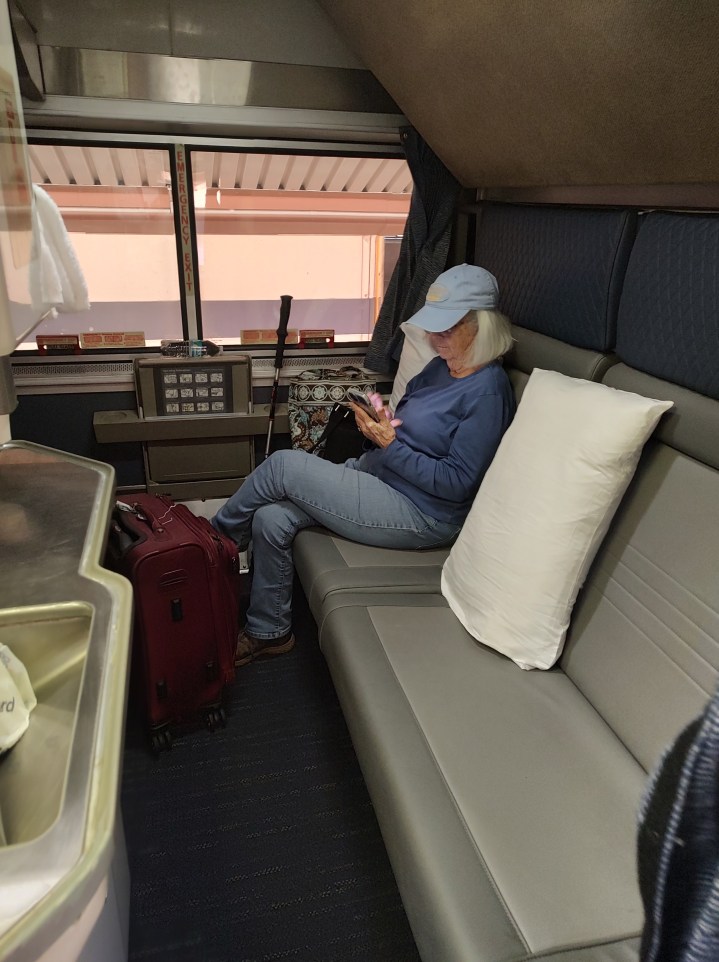 Walt Disney Concert Hall, Los Angeles, Day 2 – exploring Los Angeles on a walkaboutWalt Disney Concert Hall courtyard, Los AngelesGrand Park, downtown LA – lots of families and activity! The Broad art gallery and museum, downtown LA – last stop on the walkabout.Amtrak’s TINY bedroom, connection from LA to FlagstaffLast train connection, Grand Canyon Railroad to see NoelleIn the 1930’s, the CCC’s placed a heart shaped rock in a seat wall as a tribute to a young couple who lived & married in the Grand Canyon